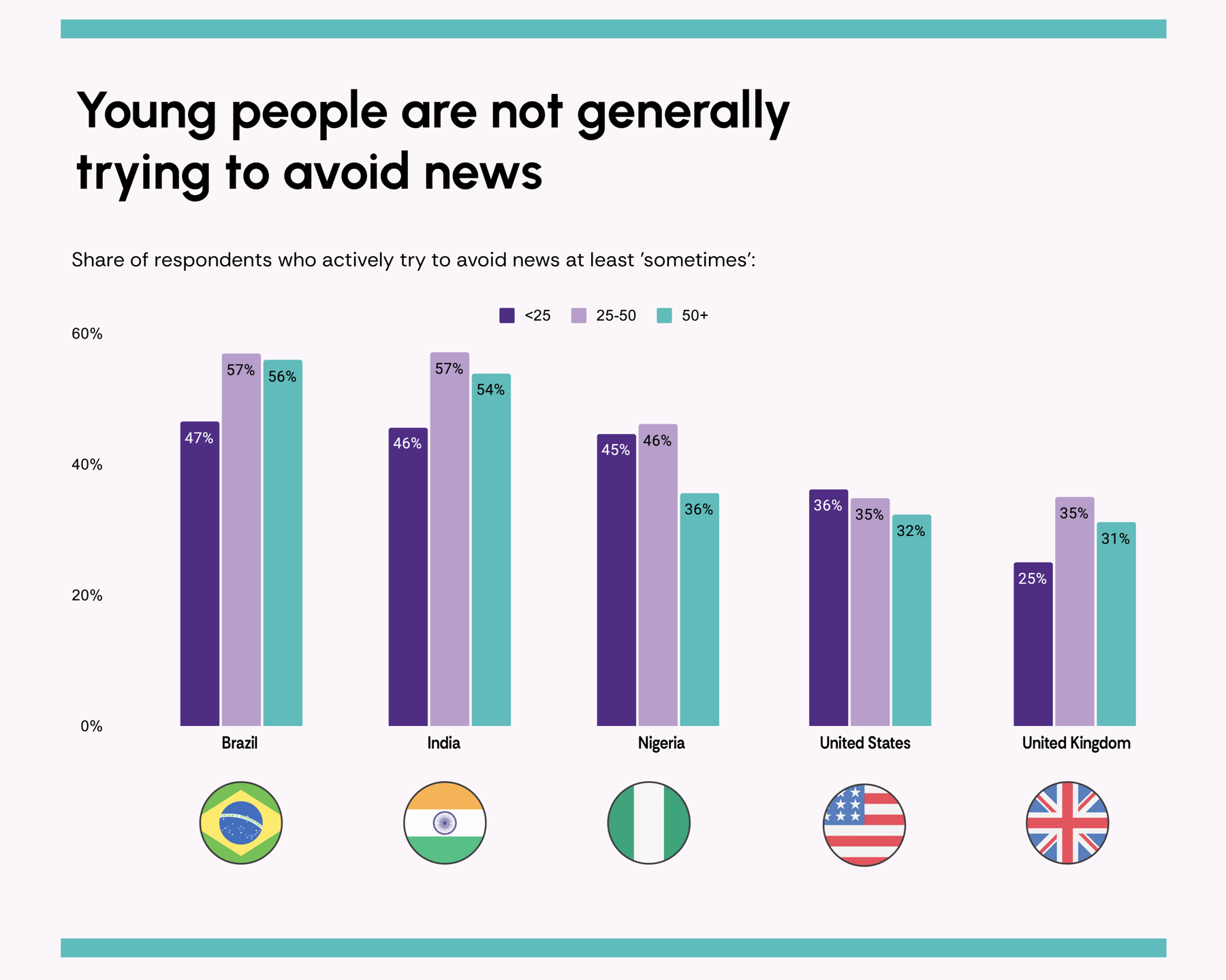 Next Gen News 2 found that isn’t necessarily the case. Across the five markets that we conducted the research, 55% of under-25s consume news daily. We also found that the proportion of people actively trying to avoid the news is between 25% and 47% across Brazil, India, Nigeria, the UK and the US — less than might be expected if you have been tracking the rise of news avoidance.